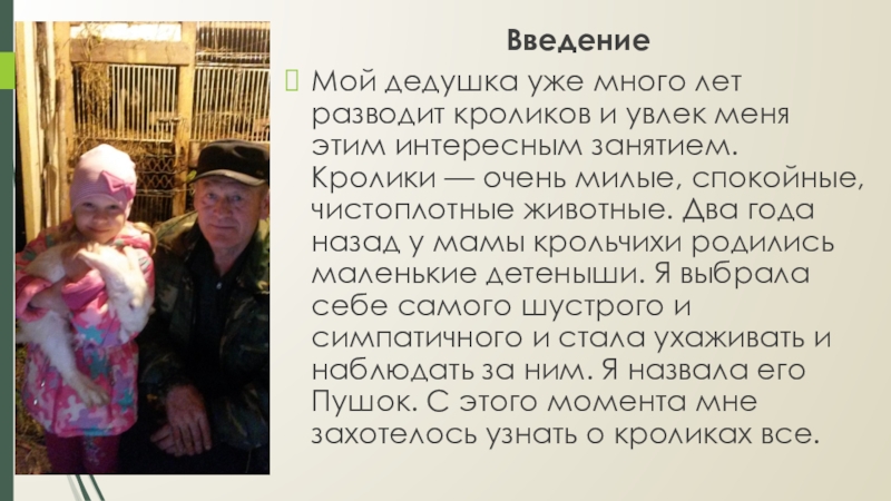 интересным занятием. Кролики — очень милые, спокойные, чистоплотные животные. Два года назад у мамы крольчихи родились маленькие детеныши. Я выбрала себе самого шустрого и симпатичного и стала ухаживать и наблюдать за ним. Я назвала его Пушок. С этого момента мне захотелось узнать о кроликах все.