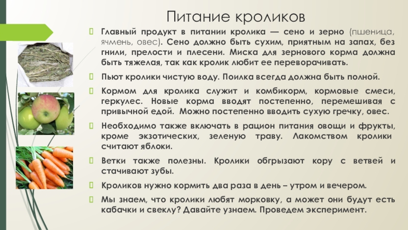 ячмень, овес). Сено должно быть сухим, приятным на запах, без гнили, прелости и плесени. Миска для зернового корма должна быть тяжелая, так как кролик любит ее переворачивать.