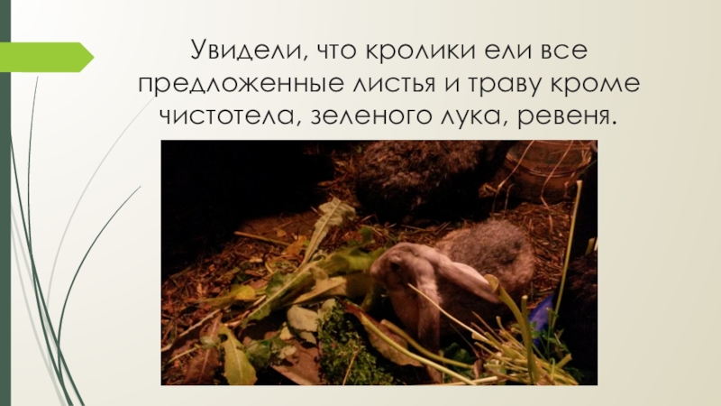 Слайд 15Увидели, что кролики ели все предложенные листья и траву кроме чистотела,
