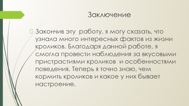 из жизни кроликов. Благодаря данной работе, я смогла провести наблюдения за вкусовыми пристрастиями кроликов и особенностями поведения. Теперь я точно знаю, чем кормить кроликов и какое у них бывает настроение.