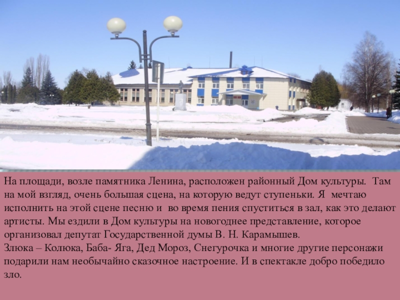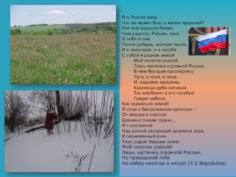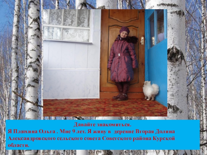 Я Плюхина Ольга . Мне 9 лет. Я живу в деревне Вторая Долина Александровского сельского совета Советского района Курской области.