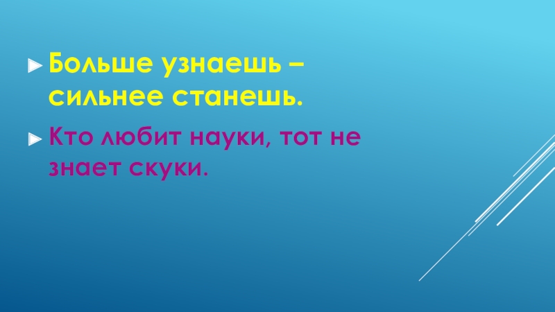 Больше узнаешь – сильнее станешь.Кто любит науки, тот не знает скуки.