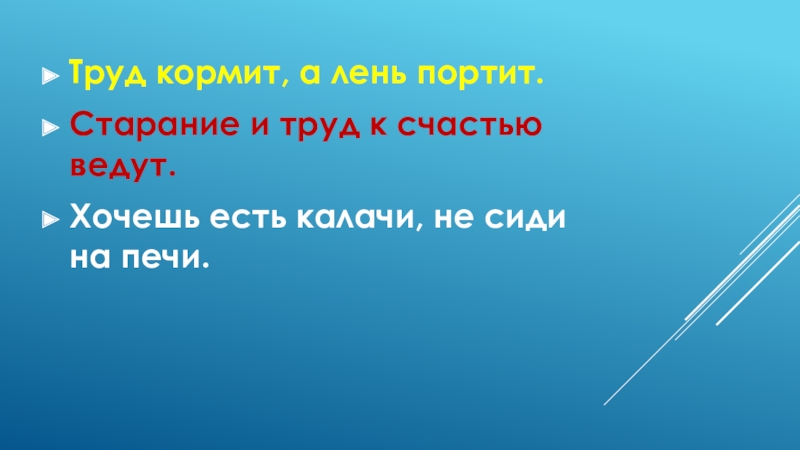 Труд кормит, а лень портит.Старание и труд к счастью ведут.Хочешь есть калачи, не сиди на печи.