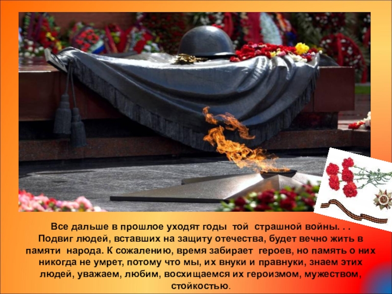 . Подвиг людей, вставших на защиту отечества, будет вечно жить в памяти народа. К сожалению, время забирает героев, но память о них никогда не умрет, потому что мы, их внуки и правнуки, знаем этих людей, уважаем, любим, восхищаемся их героизмом, мужеством, стойкостью.