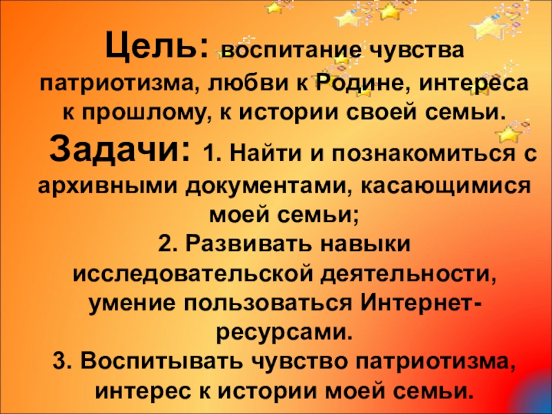 3. Воспитывать чувство патриотизма, интерес к истории моей семьи.