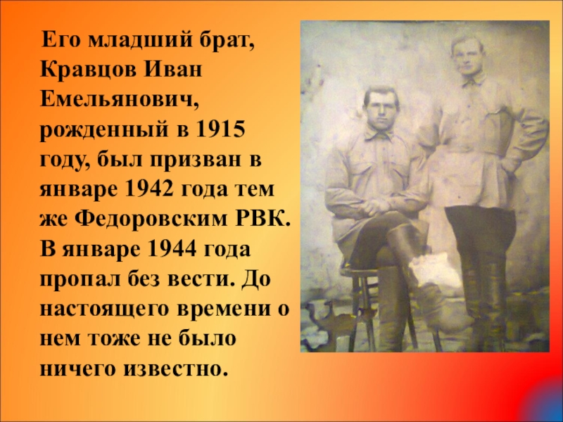 Слайд 11 Его младший брат, Кравцов Иван Емельянович, рожденный в