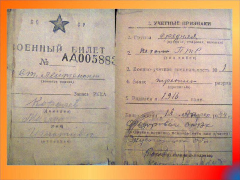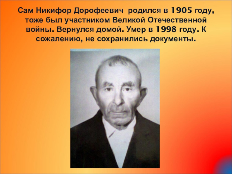 Слайд 22Сам Никифор Дорофеевич родился в 1905 году, тоже был участником Великой