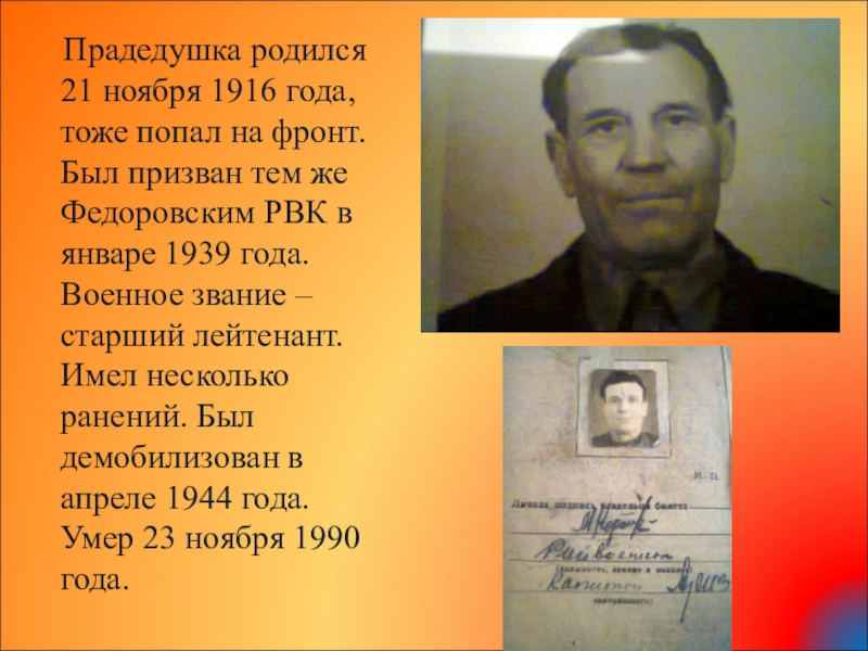 Слайд 17 Прадедушка родился 21 ноября 1916 года, тоже попал