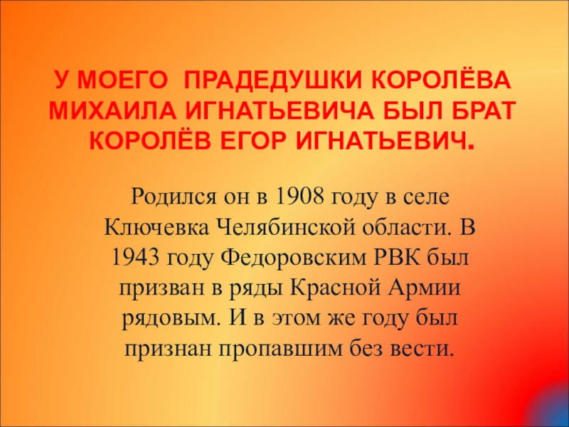 Слайд 16У МОЕГО ПРАДЕДУШКИ КОРОЛЁВА МИХАИЛА ИГНАТЬЕВИЧА БЫЛ БРАТ КОРОЛЁВ ЕГОР ИГНАТЬЕВИЧ.
