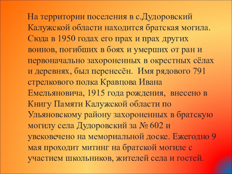 Слайд 14 На территории поселения в с.Дудоровский Калужской области находится братская