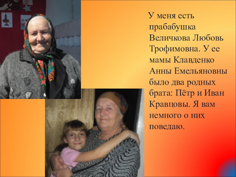 Слайд 7 У меня есть прабабушка Величкова Любовь Трофимовна. У ее