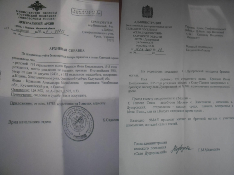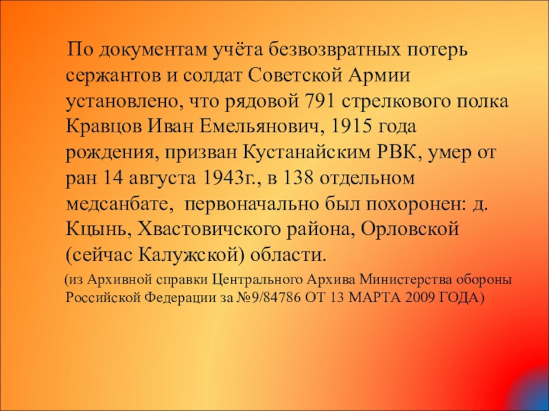Советской Армии установлено, что рядовой 791 стрелкового полка Кравцов Иван Емельянович, 1915 года рождения, призван Кустанайским РВК, умер от ран 14 августа 1943г., в 138 отдельном медсанбате, первоначально был похоронен: д.Кцынь, Хвастовичского района, Орловской (сейчас Калужской) области.