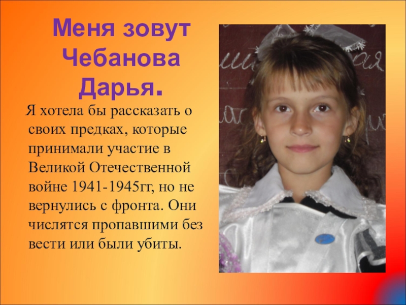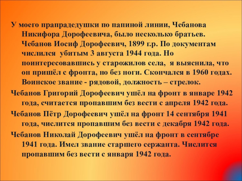 предках, которые принимали участие в Великой Отечественной войне 1941-1945гг, но не вернулись с фронта. Они числятся пропавшими без вести или были убиты.