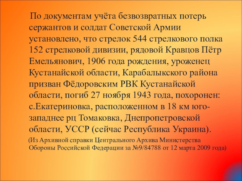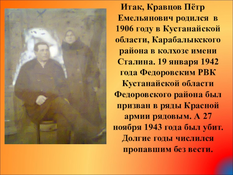 Слайд 8Итак, Кравцов Пётр Емельянович родился в 1906 году в Кустанайской области,