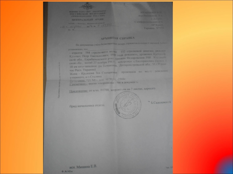 (из Архивной справки Центрального Архива Министерства обороны Российской Федерации за №9/84786 ОТ 13 МАРТА 2009 ГОДА)