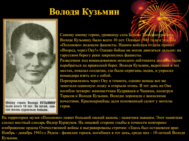 На территории музея «Поленово» лежит большой окский камень - памятник павшим. Этот памятник сделал местный слесарь Федор Куржуков. На лицевой стороне глыбы в точности повторено изображение ордена Отечественной войны и выгравированы строчки: «Здесь был остановлен враг. Ноябрь - декабрь 1941г.» Рядом - фамилии героев, погибших в тот день, среди них - 10-летний Володя Кузьмин.