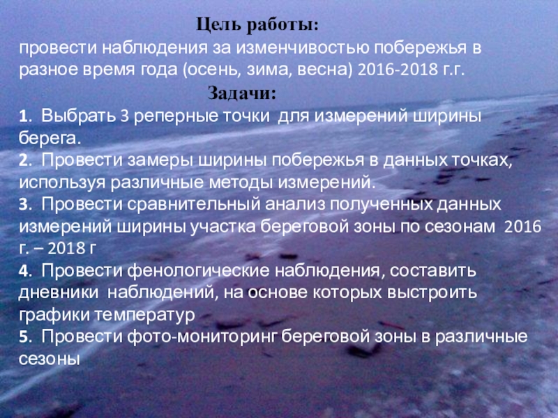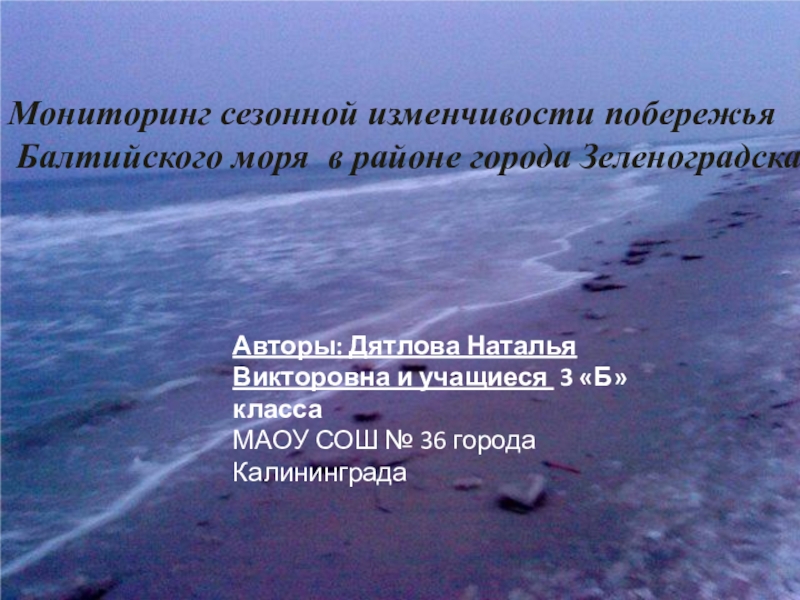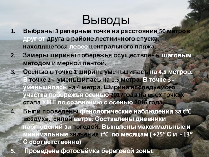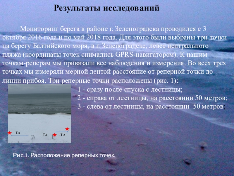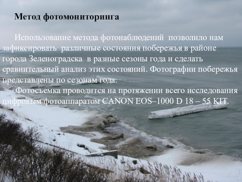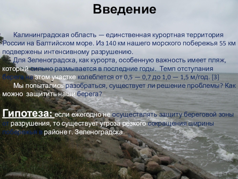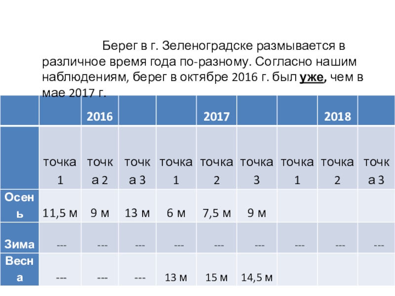 Берег в г.Зеленоградске размывается в различное время года по-разному. Согласно нашим г. был е, е 2010 г. Берег в г. Зеленоградске размывается в различное время года по-разному. Согласно нашим наблюдениям, берег в октябре 2016 г. был уже, чем в мае 2017 г.