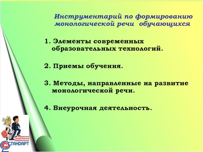Слайд 27 Инструментарий по формированию монологической речи обучающихся