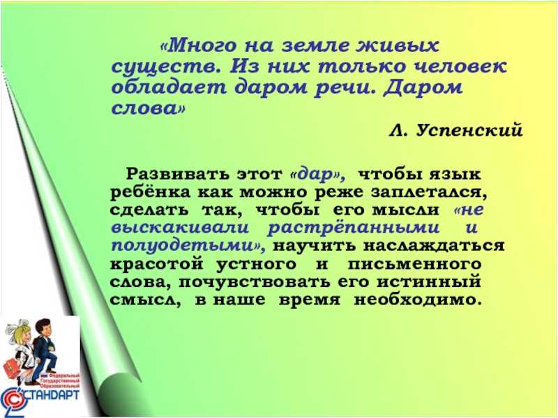 Развивать этот «дар», чтобы язык ребёнка как можно реже заплетался, сделать так, чтобы его мысли «не выскакивали растрёпанными и полуодетыми», научить наслаждаться красотой устного и письменного слова, почувствовать его истинный смысл, в наше время необходимо.