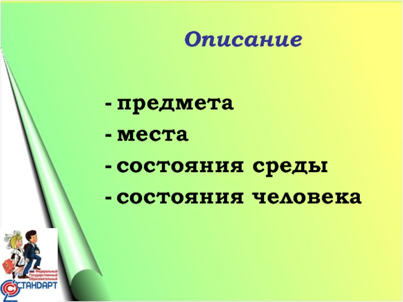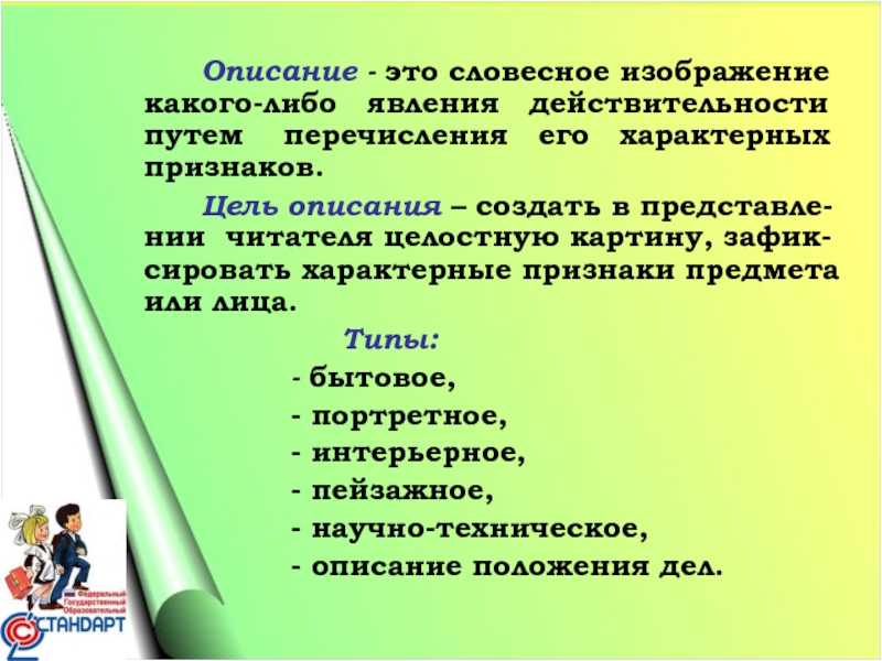 Цель описания – создать в представле-нии читателя целостную картину, зафик-сировать характерные признаки предмета или лица.