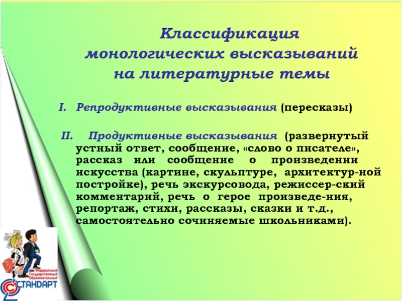 Продуктивные высказывания (развернутый устный ответ, сообщение, «слово о писателе», рассказ или сообщение о произведении искусства (картине, скульптуре, архитектур-ной постройке), речь экскурсовода, режиссер-ский комментарий, речь о герое произведе-ния, репортаж, стихи, рассказы, сказки и т.д., самостоятельно сочиняемые школьниками).