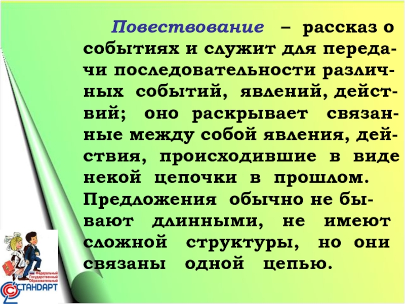 служит для переда-чи последовательности различ-ных событий, явлений, дейст-вий; оно раскрывает связан-ные между собой явления, дей-ствия, происходившие в виде некой цепочки в прошлом. Предложения обычно не бы-вают длинными, не имеют сложной структуры, но они связаны одной цепью.