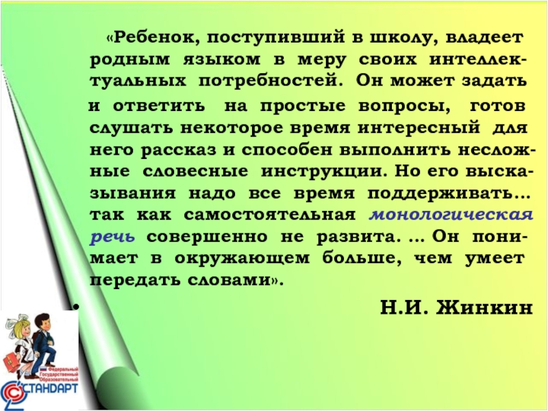 Слайд 4 «Ребенок, поступивший в школу, владеет родным языком в