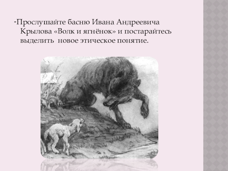 -Прослушайте басню Ивана Андреевича Крылова «Волк и ягнёнок» и постарайтесь выделить новое этическое понятие.