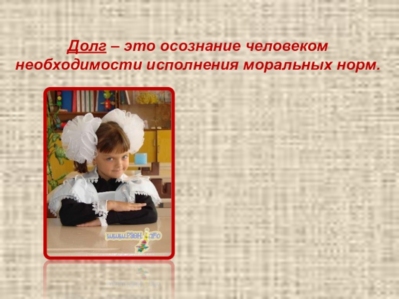 Слайд 2Долг – это осознание человеком необходимости исполнения моральных норм.