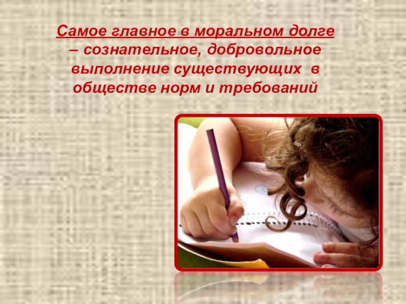 Слайд 14Самое главное в моральном долге – сознательное, добровольное выполнение существующих в