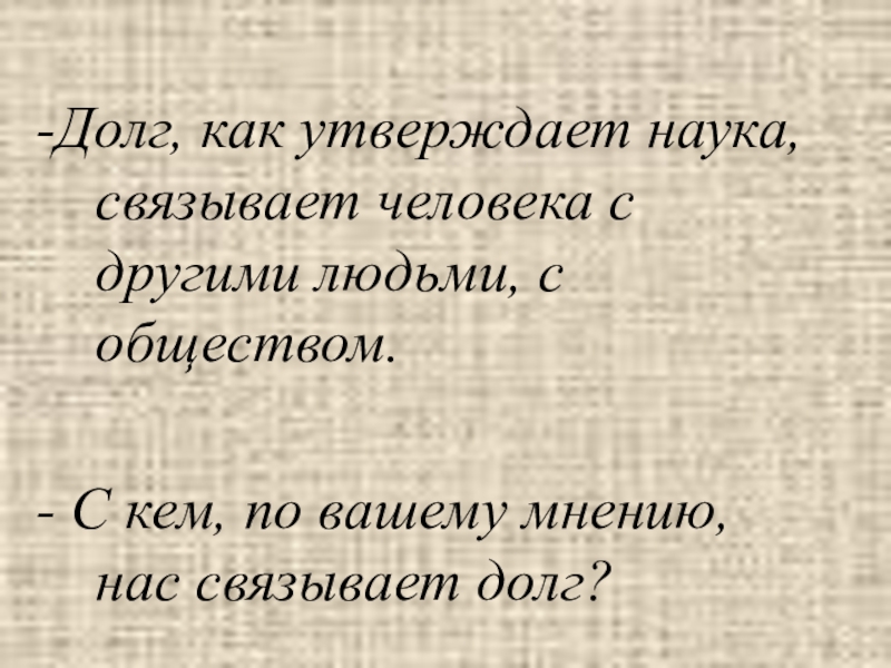 -Долг, как утверждает наука, связывает человека с другими людьми, с обществом.