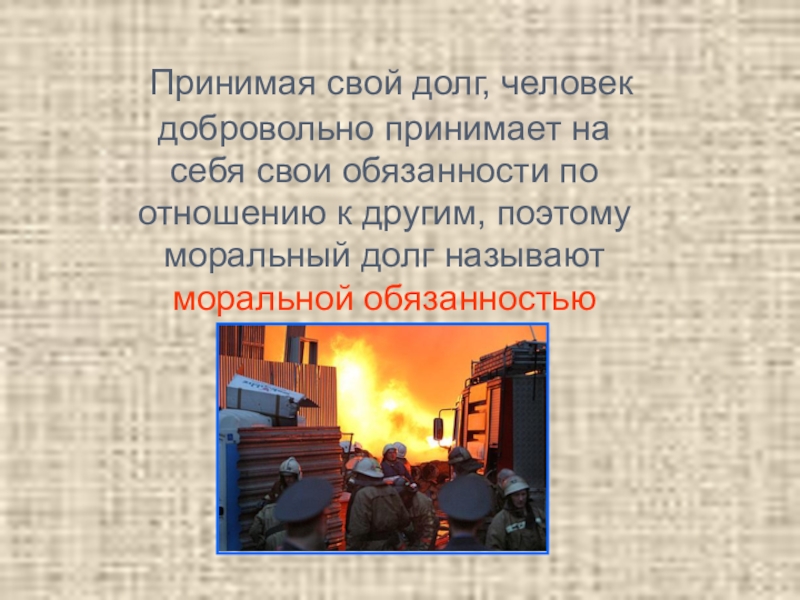 Слайд 16 Принимая свой долг, человек добровольно принимает на себя свои обязанности