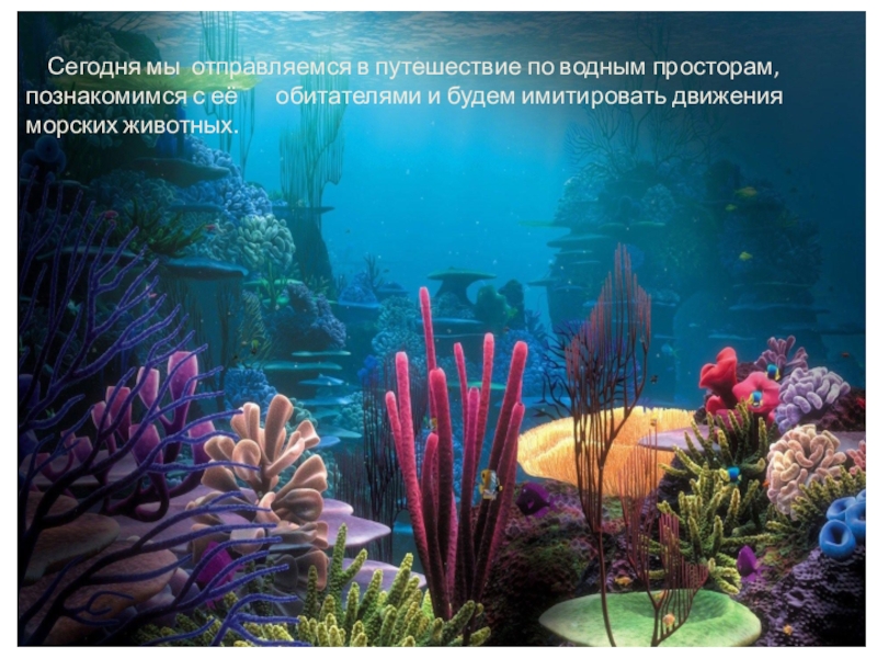 Сегодня мы отправляемся в путешествие по водным просторам, познакомимся с её обитателями и будем имитировать движения морских животных.
