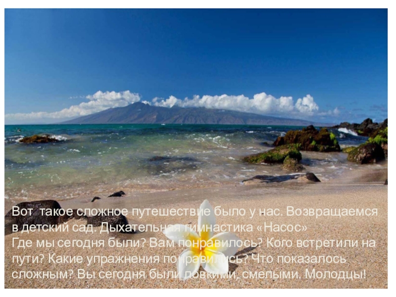 Вот такое сложное путешествие было у нас. Возвращаемся в детский сад. Дыхательная гимнастика «Насос»Где мы сегодня были?