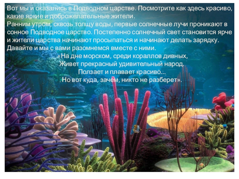 Слайд 3Вот мы и оказались в Подводном царстве. Посмотрите как здесь красиво,