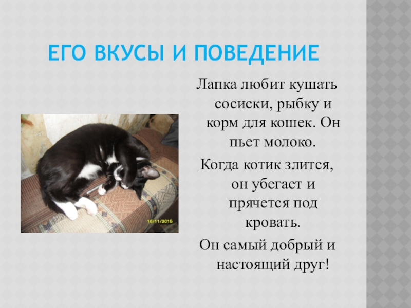 Его вкусы и поведениеЛапка любит кушать сосиски, рыбку и корм для кошек. Он пьет молоко. Когда котик