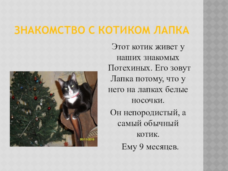 Знакомство с котиком ЛапкаЭтот котик живет у наших знакомых Потехиных. Его зовут Лапка потому, что у него на лапках белые носочки. Он непородистый, а самый обычный котик. Ему 9 месяцев.