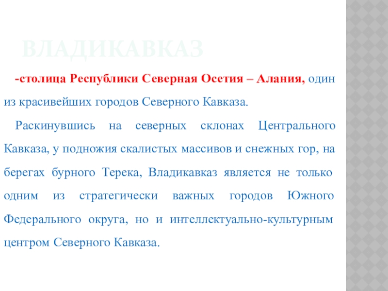 владикавказ-столица Республики Северная Осетия – Алания, один из красивейших городов Северного Кавказа. Раскинувшись на северных склонах Центрального Кавказа, у подножия скалистых массивов и снежных гор, на берегах бурного Терека, Владикавказ является не только одним из стратегически