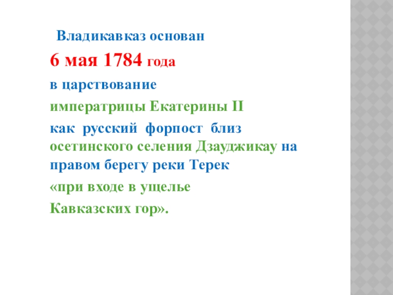 Владикавказ основан 6 мая 1784 года в царствование императрицы Екатерины II как русский форпост близ осетинского