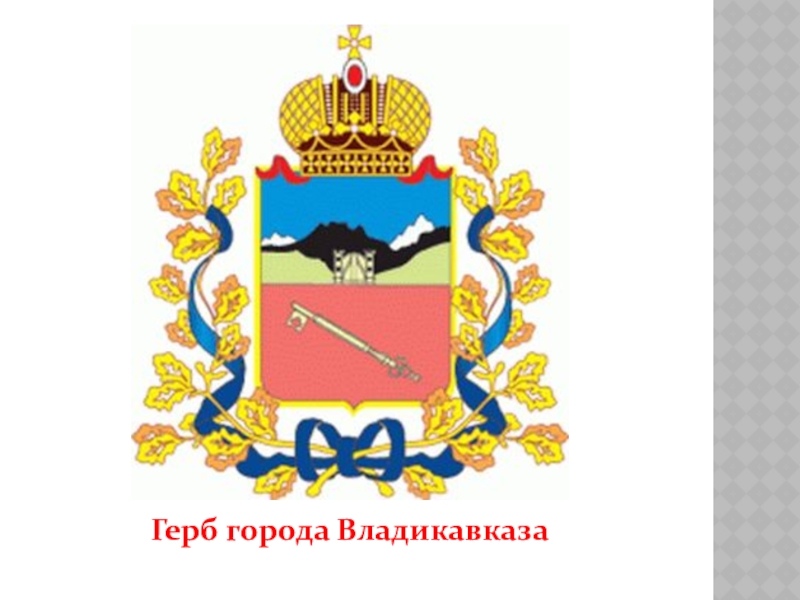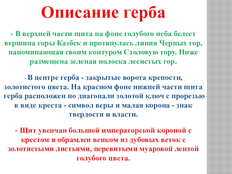 белеет вершина горы Казбек и протянулась линия Черных гор, напоминающая своим контуром Столовую гору. Ниже размещена зеленая полоска лесистых гор. - В центре герба - закрытые ворота крепости, золотистого цвета. На красном фоне нижней части щита герба расположен по диагонали золотой ключ с прорезью в виде креста - символ веры и малая корона - знак твердости и власти. - Щит увенчан большой императорской короной с крестом и обрамлен венком из дубовых веток с золотистыми листьями, перевитыми муаровой лентой голубого цвета.