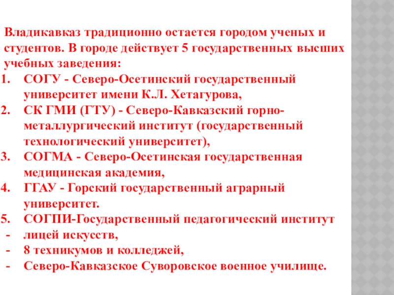 Владикавказ традиционно остается городом ученых и студентов. В городе действует 5 государственных высших учебных заведения: СОГУ -