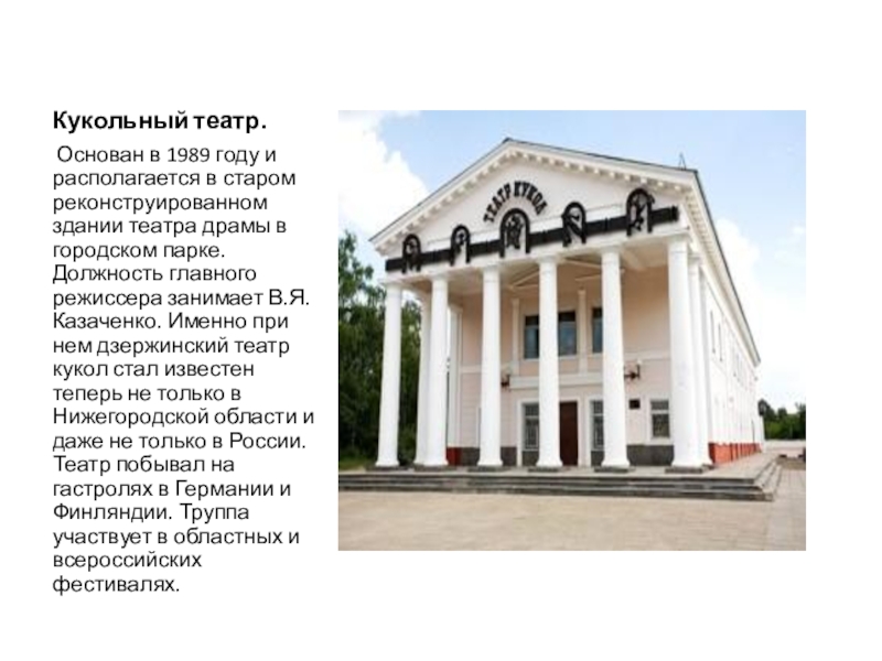 театра драмы в городском парке. Должность главного режиссера занимает В.Я. Казаченко. Именно при нем дзержинский театр кукол стал известен теперь не только в Нижегородской области и даже не только в России. Театр побывал на гастролях в Германии и Финляндии. Труппа участвует в областных и всероссийских фестивалях.