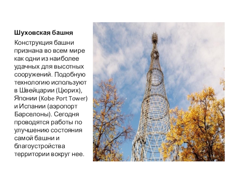 удачных для высотных сооружений. Подобную технологию используют в Швейцарии (Цюрих), Японии (Kobe Port Tower) и Испании (аэропорт Барселоны). Сегодня проводятся работы по улучшению состояния самой башни и благоустройства территории вокруг нее.