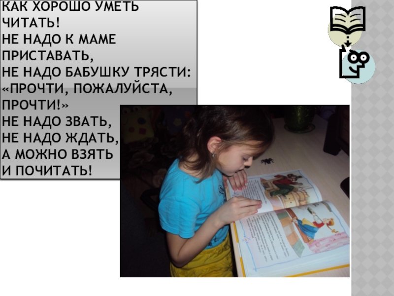 Слайд 7Как хорошо уметь читать! Не надо к маме приставать, Не надо бабушку трясти: «Прочти,