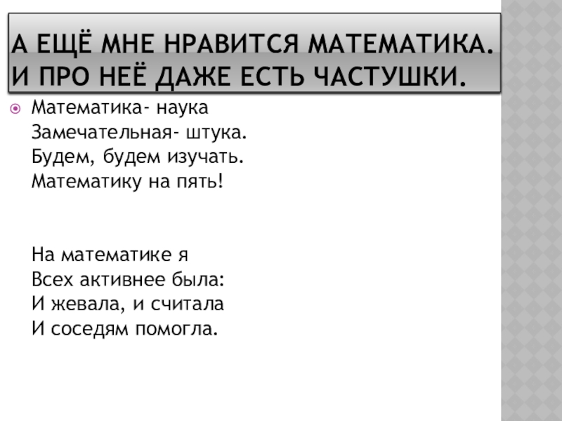 Слайд 8А ещё мне нравится математика. И про неё даже есть частушки.