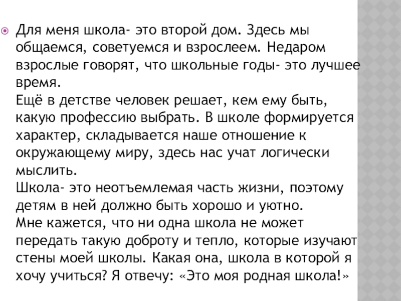 взрослеем. Недаром взрослые говорят, что школьные годы- это лучшее время. Ещё в детстве человек решает, кем ему быть, какую профессию выбрать. В школе формируется характер, складывается наше отношение к окружающему миру, здесь нас учат логически мыслить. Школа- это неотъемлемая часть жизни, поэтому детям в ней должно быть хорошо и уютно. Мне кажется, что ни одна школа не может передать такую доброту и тепло, которые изучают стены моей школы. Какая она, школа в которой я хочу учиться? Я отвечу: «Это моя родная школа!»