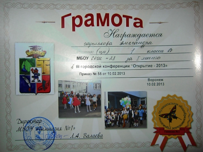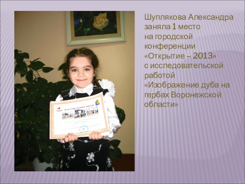 Шуплякова Александра заняла 1 место на городской конференции «Открытие – 2013» с исследовательской работой «Изображение дуба на