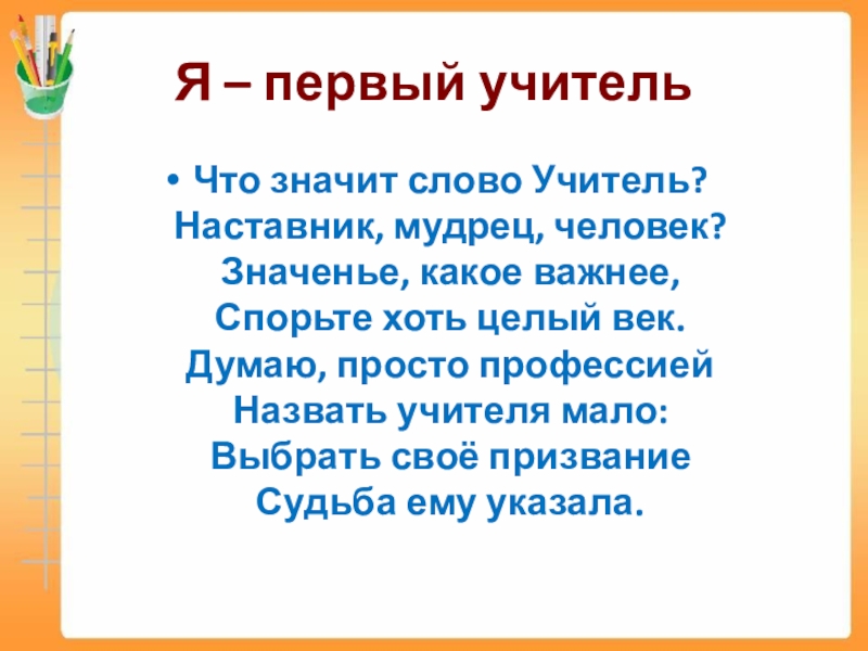 Я – первый учительЧто значит слово Учитель? Наставник, мудрец, человек? Значенье, какое важнее, Спорьте хоть целый век.