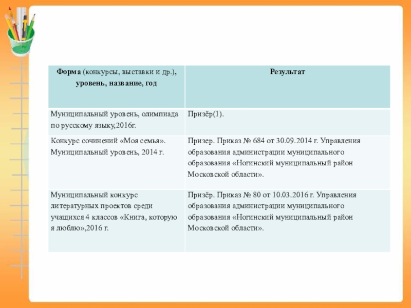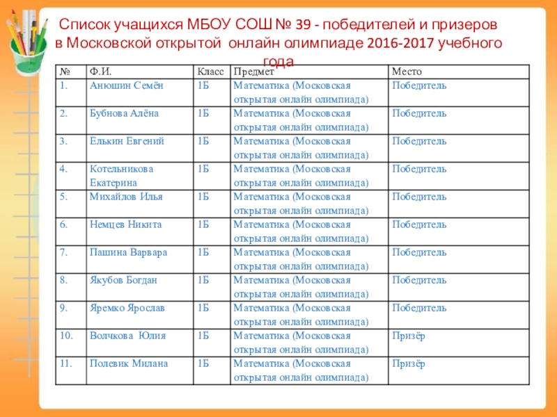 Слайд 10Список учащихся МБОУ СОШ № 39 - победителей и призеров в Московской