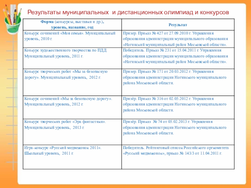 Слайд 8Результаты муниципальных и дистанционных олимпиад и конкурсов